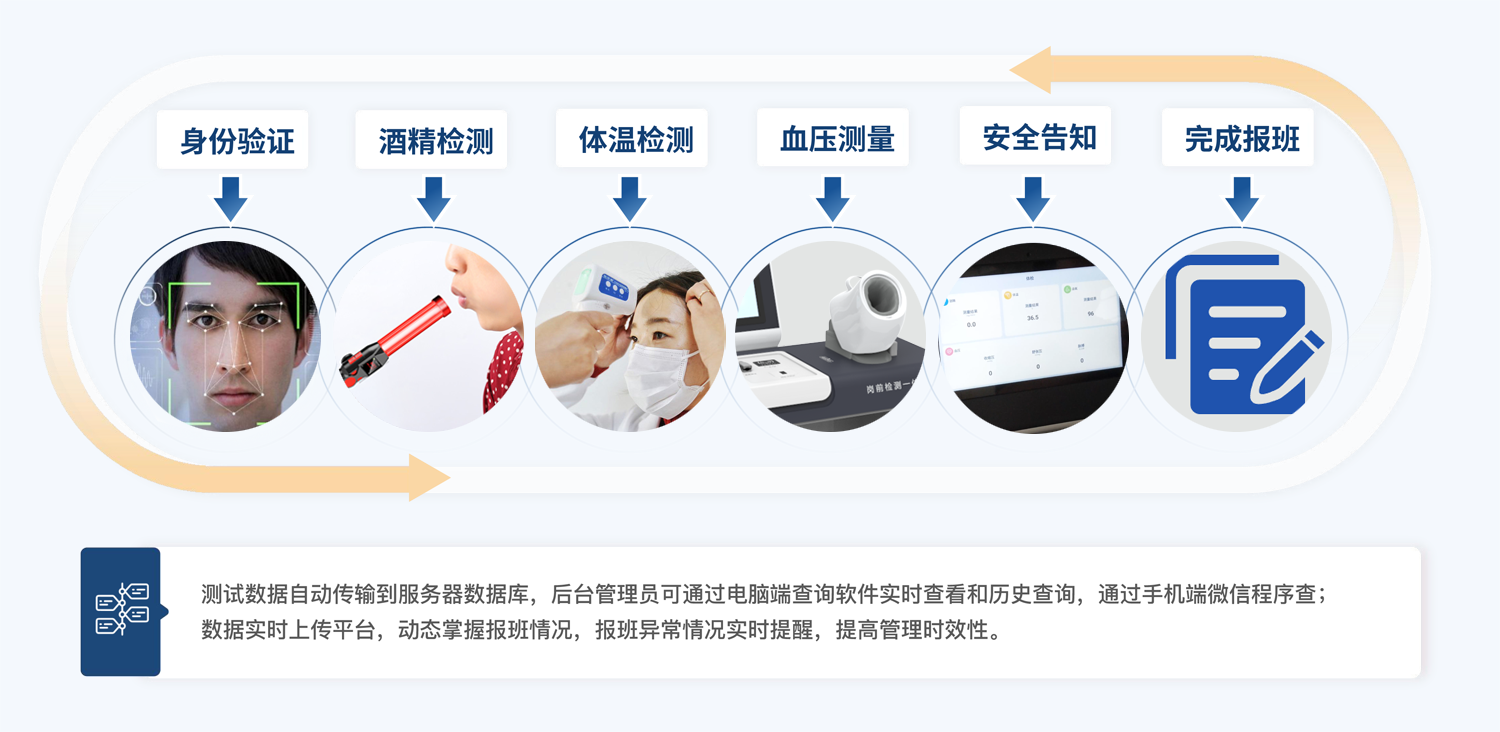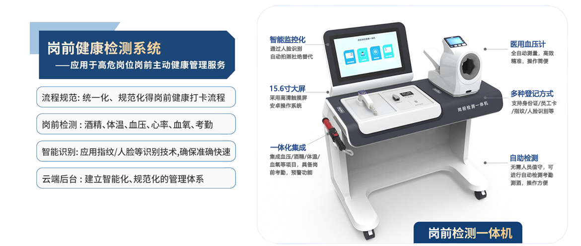崗前健康檢查一體機是一種用于進行員工健康檢查和篩查的設(shè)備,可以通過指紋識別、人臉識別等方式快速登錄,并可準確地檢測員 工的健康狀況,包括 血壓、心率、酒精、體溫、血氧 等多個項目,對于符合上崗健康狀態(tài)得員工允許考勤打卡。