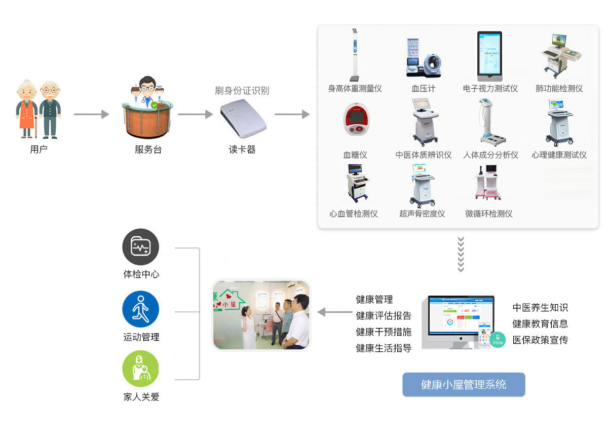 健康小屋是根據時代發(fā)展、社會需求與疾病譜的改變,搭建的一種全局的健康檢查方式,由政府主導,公共衛(wèi)生機構提供,或者企事業(yè)單位、社區(qū)、養(yǎng)老機構等自建,以提供全面的健康服務,提高轄區(qū)人員整體健康水平,樹立完善的服務品牌。