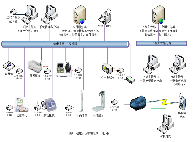 社區(qū)健康小屋一體化實(shí)施方案,包含有一臺(tái)主控計(jì)算機(jī)、一個(gè)由該主控計(jì)算機(jī)控制的身高體重儀、血壓儀、血糖儀、肺功能儀、動(dòng)脈硬化檢測(cè)儀、骨密度檢測(cè)儀、心電儀