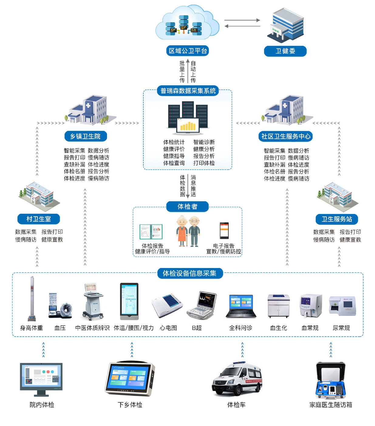 普瑞森公衛(wèi)數(shù)據(jù)智能采集系統(tǒng)一一縣鄉(xiāng)村一體化方案以滿足公衛(wèi)考核為基本要求,充分緩解基層公衛(wèi)人員入手少,任務(wù)重的問題,充分調(diào)動鄉(xiāng)鎮(zhèn)衛(wèi)圭院和村衛(wèi)生室的積極作用,通過智能建擋和高效體檢以及健康數(shù)據(jù)實時傳輸?shù)葮I(yè)務(wù),為全域居民建立“以健康為中心、以數(shù)據(jù)為依托”的健康服務(wù)體系,利用物聯(lián)網(wǎng)+智能信息化應(yīng)用,建設(shè)統(tǒng)一、規(guī)范、標準的慢病管理中心,提升基層醫(yī)生對慢病患者的服務(wù)質(zhì)量和管理水平。